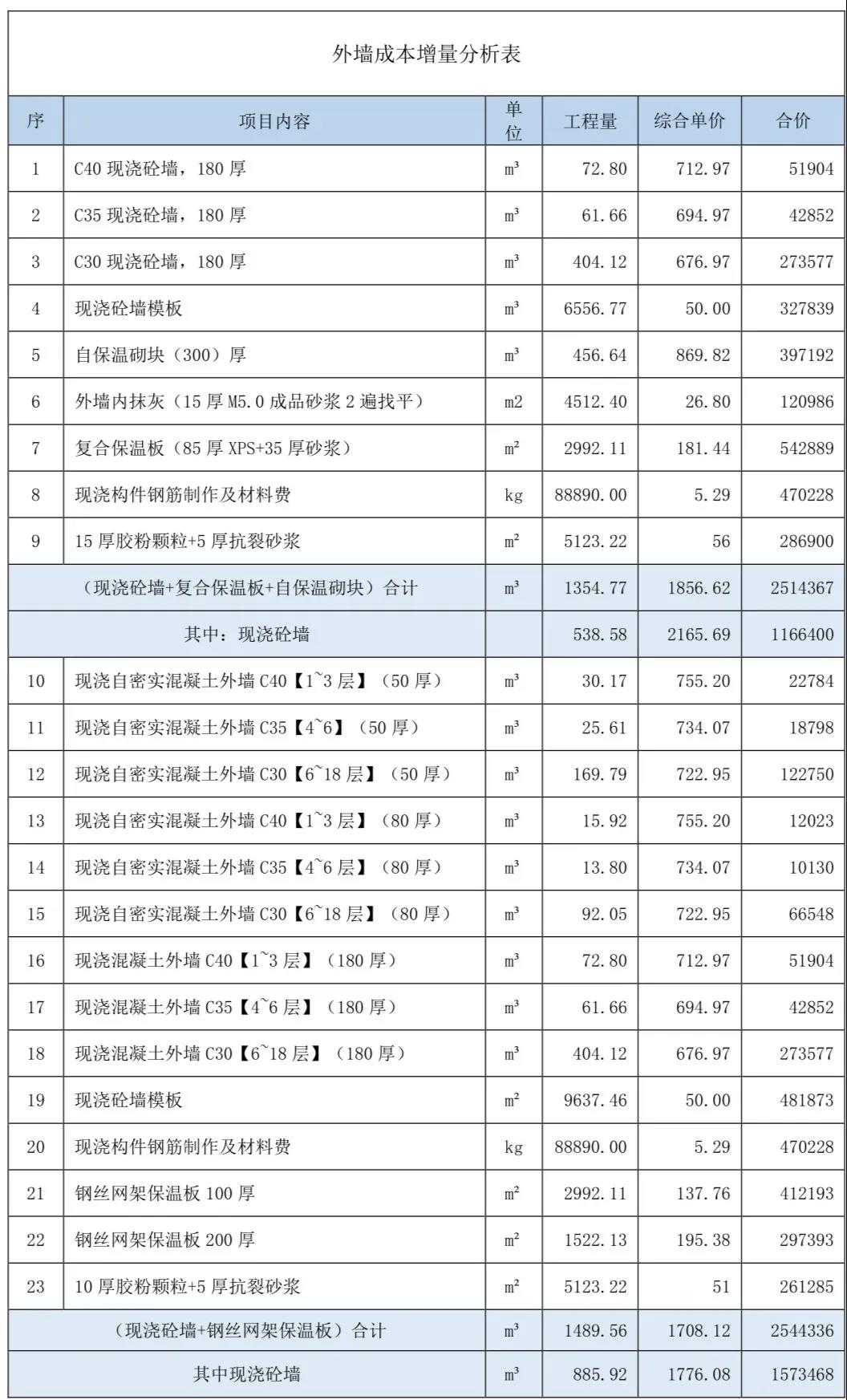 (3)鋼絲網(wǎng)架現(xiàn)澆砼復(fù)合保溫系統(tǒng)的成本增量大小受原保溫系統(tǒng)做法的影響較大。(4)結(jié)構(gòu)工程量含量指標(biāo)對比分析表
